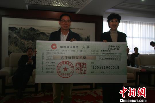 珠海市華策集團(tuán)董事局主席楊峰(左)向中國文聯(lián)黨組書記、副主席趙實(shí)(右)捐贈2500萬元,用于翰墨薪傳·全國中小學(xué)書法教師培訓(xùn)項目。