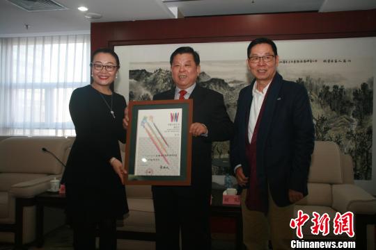 全國政協(xié)常委、中國文學(xué)藝術(shù)基金會理事長胡振民(中)向珠海市華策集團(tuán)董事局主席楊峰(右)、董事趙日云(左)頒發(fā)捐贈證書。