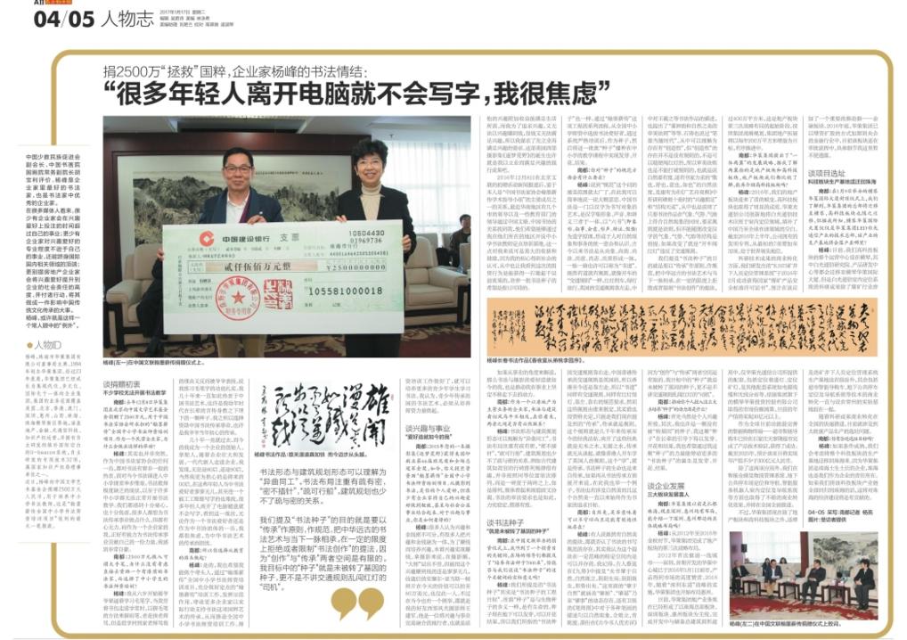 楊峰:其實也并非突然,作為中國書法家協會的任何一員,都對書法有著非一般的熱衷。面對當今書法課進入中小學課堂舉步維艱,書法教師極度缺乏的現狀,以至于許多中小學都無法正常開展書法教學。我們都感到十分痛心,也十分焦慮,很多人都想為書法傳承事業做點什么,但都有心無力。而作為一個企業家的我,正好有能力為書法傳承事業貢獻自己的一份力量,我感到非常自豪。