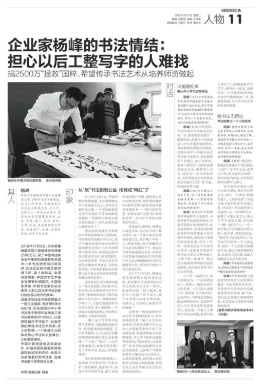 楊峰:其實并非突然,作為中國書法家協會的任何一員,都對書法有著非一般的熱衷。面對當今書法課進入中小學課堂舉步維艱,書法教師極度缺乏的現狀,以致許多中小學都無法正常開展書法教學。我們都感到十分痛心,也十分焦慮,很多人都想為書法傳承事業做點什么,但都有心無力。而作為一個企業家的我,正好有能力為書法傳承事業貢獻自己的一份力量,我感到非常自豪。