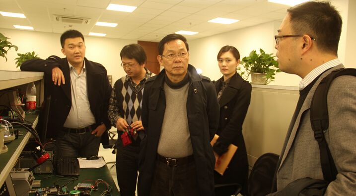 珠海市華策集團(tuán)董事長楊峰(中)在國家半導(dǎo)體照明工程研發(fā)及產(chǎn)業(yè)聯(lián)盟副秘書長付強(qiáng)(右)陪同下,參觀半導(dǎo)體聯(lián)合創(chuàng)新國家重點(diǎn)實(shí)驗(yàn)室常州基地LED白光通訊實(shí)驗(yàn)室。