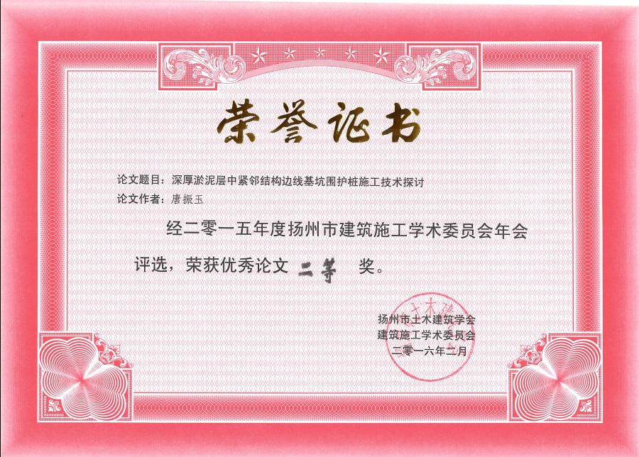 2016年2月23日至24日,由揚(yáng)州市科學(xué)技術(shù)協(xié)會(huì)主辦,揚(yáng)州市土木建筑學(xué)會(huì)、建筑施工學(xué)術(shù)委員會(huì)協(xié)辦的2016揚(yáng)州科技論壇土建學(xué)會(huì)分論壇建筑施工學(xué)術(shù)論文交流會(huì)在揚(yáng)州怡園飯店召開。江蘇華建華策國際大廈項(xiàng)目部報(bào)送的4篇論文:《超深三軸攪拌樁在珠海橫琴華策國際大廈工程深基坑中的應(yīng)用》及《BIM技術(shù)在華策國際大廈施工管理中的應(yīng)用》獲得一等獎(jiǎng),《珠海橫琴華策國際大廈項(xiàng)目超長旋挖灌注樁鉆巖施工技術(shù)》及《深厚淤泥層中緊鄰結(jié)構(gòu)邊線基坑圍護(hù)樁施工技術(shù)探討》獲得二等獎(jiǎng),并被推薦至江蘇省土木建筑協(xié)會(huì)參加交流,加上2014年度2篇獲獎(jiǎng)?wù)撐模卷?xiàng)目已有6篇論文獲得省、市級(jí)獎(jiǎng)項(xiàng)。