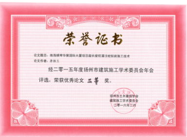 《超深三軸攪拌樁在珠海橫琴華策國際大廈工程深基坑中的應(yīng)用的榮譽(yù)證書》