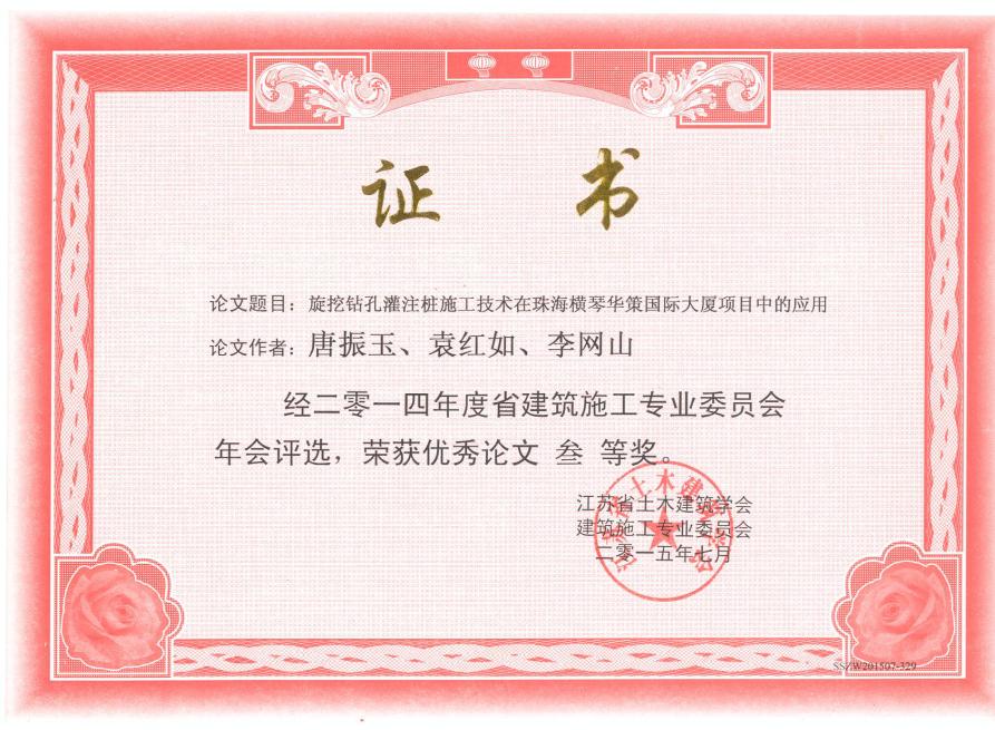 《旋挖鉆孔灌注樁施工技術(shù)在珠海橫琴華策國際大廈項(xiàng)目中的應(yīng)用的證書》