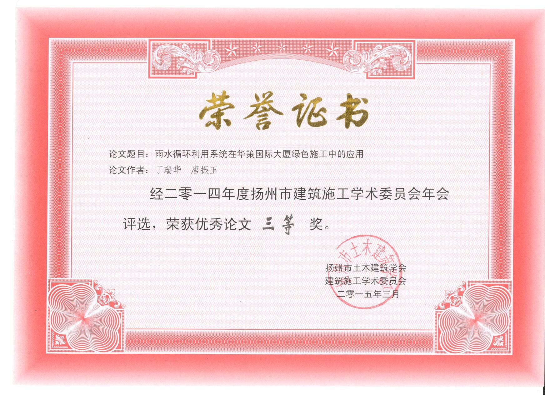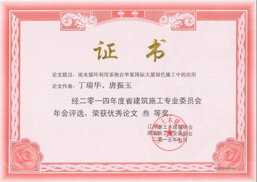 《雨水循環(huán)利用系統(tǒng)在華策國際大廈綠色施工中的應(yīng)用的榮譽(yù)證書》