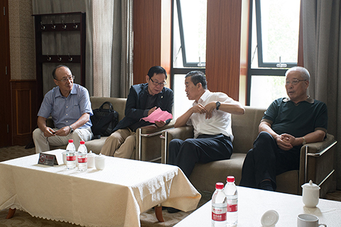 中國書法家協(xié)會“翰墨薪傳”學術指導小組副主任、華策集團董事局主席楊峰(左二)與中國書法家協(xié)會主席蘇士澍(左三)討論“翰墨薪傳”項目未來發(fā)展事宜