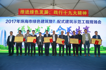 現場進行了2016~2017年度珠海市建筑節能及綠色建筑示范項目建設企業頒獎典禮,為這一年度獲得綠色建筑設計標識的10個單位頒發了示范項目牌匾和證書。獲獎單位為:珠海華達新能源科技有限公司、珠海奧華企業管理咨詢有限公司、珠海華發投資發展有限公司、珠海市政府投資項目建設監督管理中心、珠海欣業綠色能源科技有限公司、珠海藍琴發展有限公司、珠海市金灣區聯港基礎投資有限公司、珠海市橫琴新區勵盈房地產開發有限公司、珠海市萬潤置業發展有限公司、珠海市萬有引力房地產有限公司。此獎項的頒發為鼓勵各企業以建設生態環保城市為目標,大膽探索建設,發展綠色建筑。