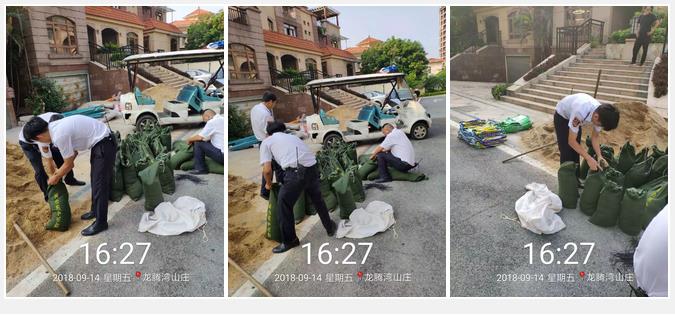 臺風襲擊前48小時,應急預案啟動,防汛沙袋等設施全部到位,各個小區保安隊挨家挨戶上門提醒業主關好門窗,做好安全防范措施,統一制定各服務中心工作人員值班制度,組織24小時應急隊伍,隨時準備應對突發險情,各負責人牽頭現場指引,保證人車安全。
