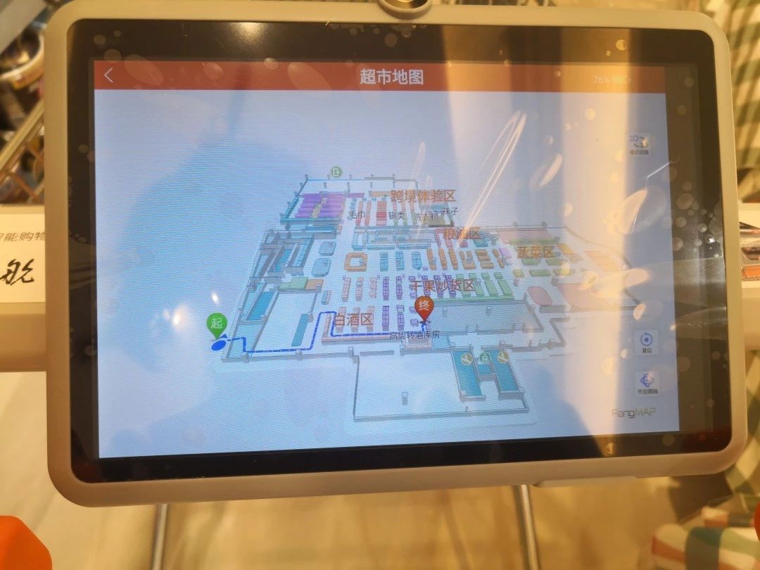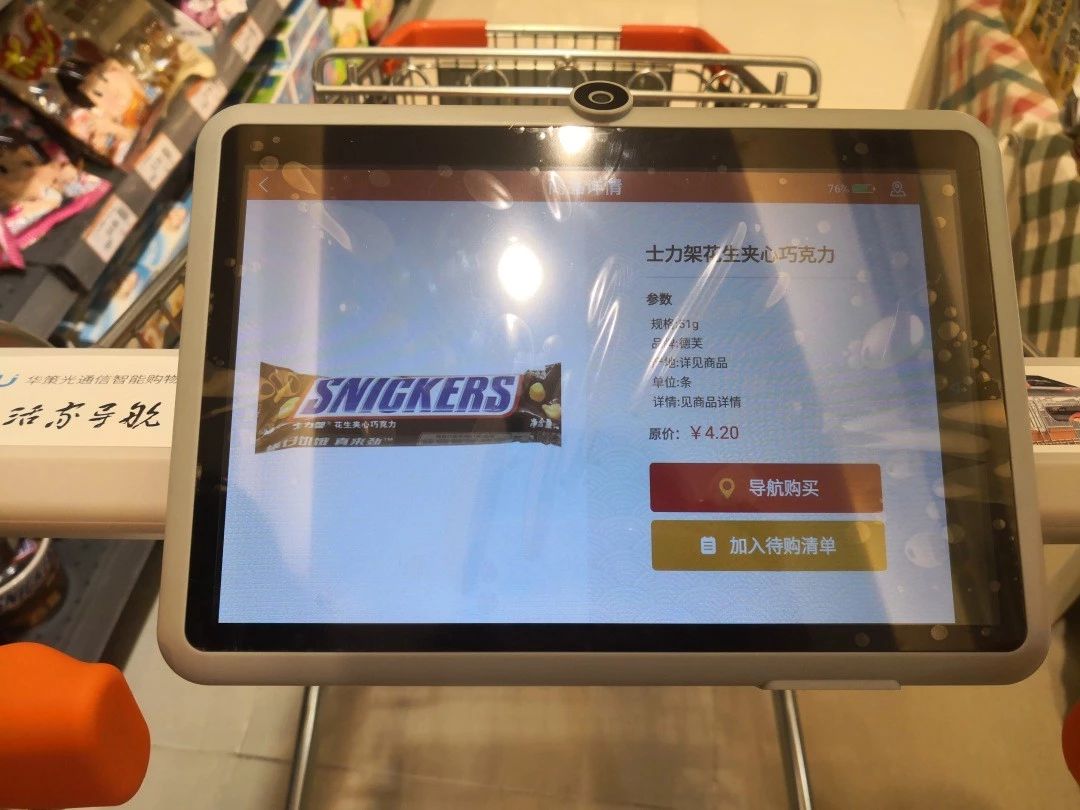 由華策光通信研發的華策智能購物車,采用厘米級定位核心技術,定位精度達到0.3米以內,其自主研發的白光通信技術,擁有眾多國內外核心專利,解決了室內精準定位這一世界性的難題。獨有的一體式整車設計,360度定位旋轉跟隨,搭配12寸超大高清分辨率顯示屏,續航12小時以上的大容量電池。對比傳統的超市購物車形象,華麗的設置帶給購物全新的體驗。