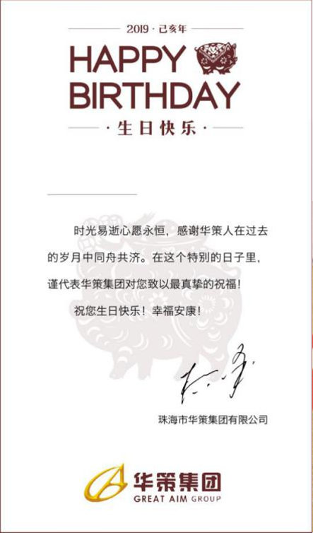 今年,集團(tuán)文宣部同事依然加入了“私人訂制禮物”環(huán)節(jié),即在購(gòu)置禮物前提前詢問壽星們的心意。值得一提的是,今年的生日賀卡,不僅保留了集團(tuán)董事局楊峰主席的簽名,還加入了已亥年的獨(dú)有元素,精美且獨(dú)具收藏價(jià)值。每一份禮物、每一張賀卡都蘊(yùn)含著華策集團(tuán)對(duì)每一位壽星的濃濃祝福。