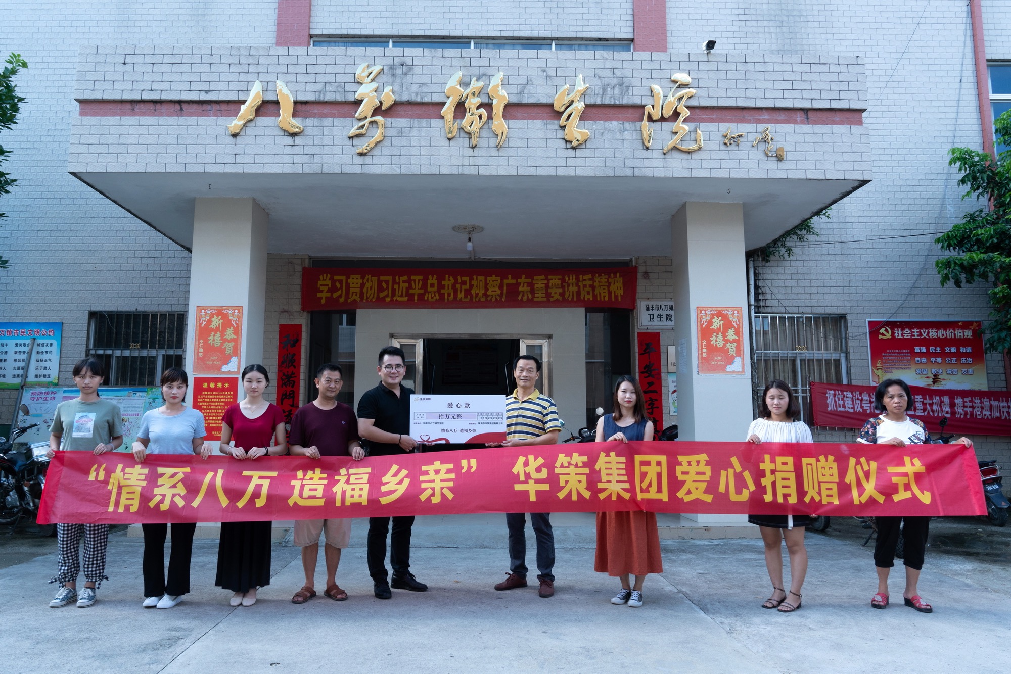 華策集團辦公室副主任黃培河(左五)、八萬鎮(zhèn)衛(wèi)生院院長周小京(右四)等在捐贈儀式上合影