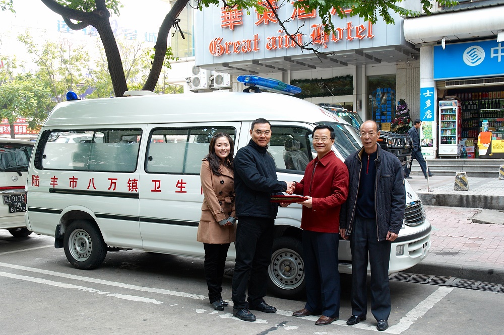 2009年華策集團董事局常務(wù)副主席楊智雄(左二)代表華策集團捐贈愛心救護車并與八萬鎮(zhèn)衛(wèi)生院院長周小京(右二)等在捐贈儀式上合影