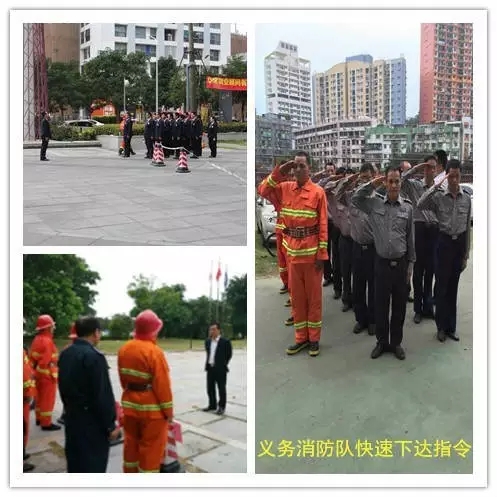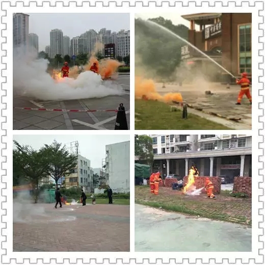 華策南灣國際公館、嶺峰國際花園、粵海國際花園、龍騰灣山莊四個項目在項目經理的組織下,義務消防隊員接到火災指令后,迅速集合,在最短的時間內趕到火災現場,熟練的將消防水帶連接消防栓滅火、疏散、救援。隨后,隊長指導消防隊員,演練用干粉滅火器進行現場滅火。